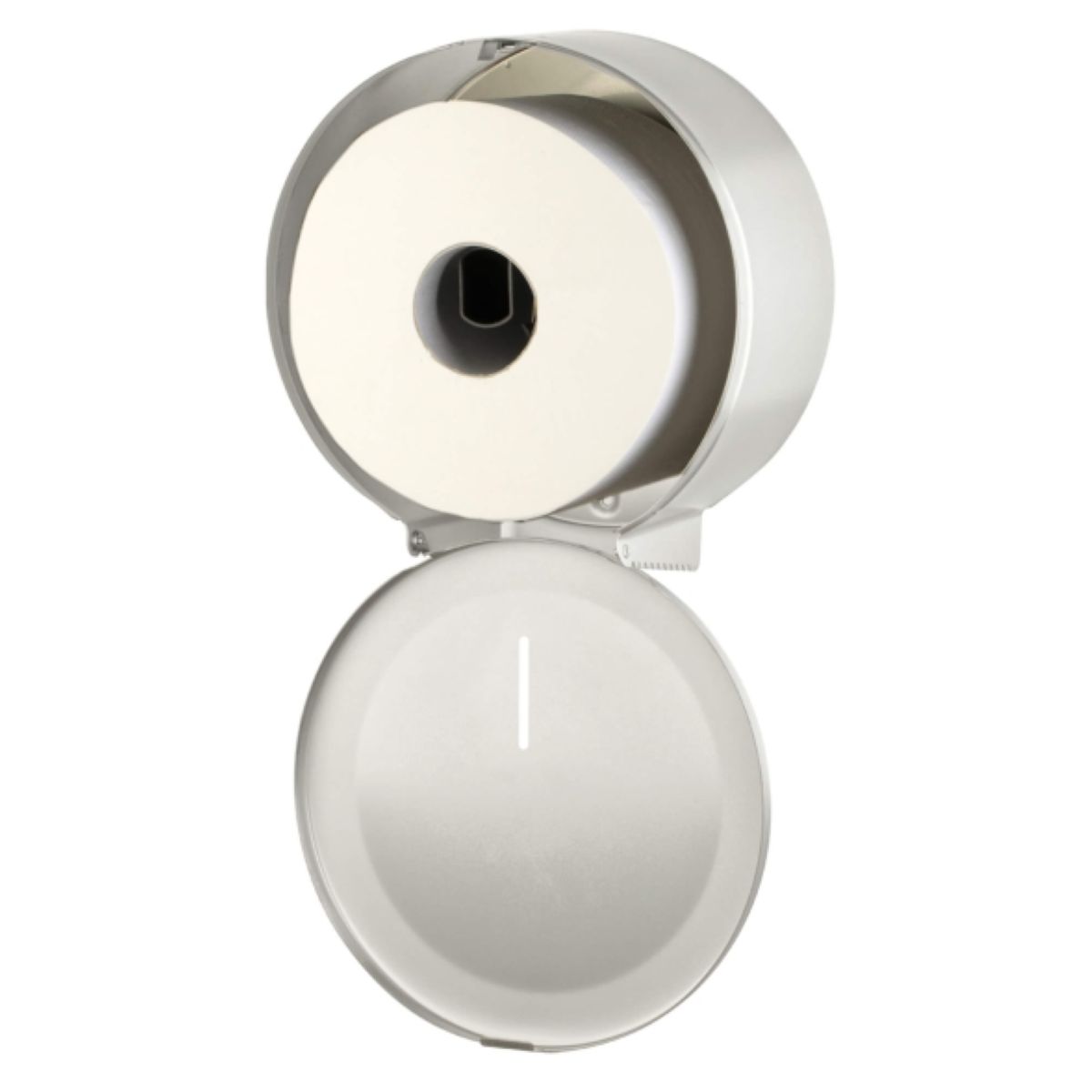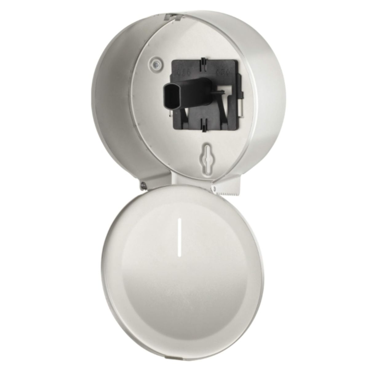 Диспенсер позволяет применять профессиональную туалетную бумагу в рулонах средней и малой намотки, а специальное смотровое окно обеспечивает визуальный контроль расхода и замены рулона.