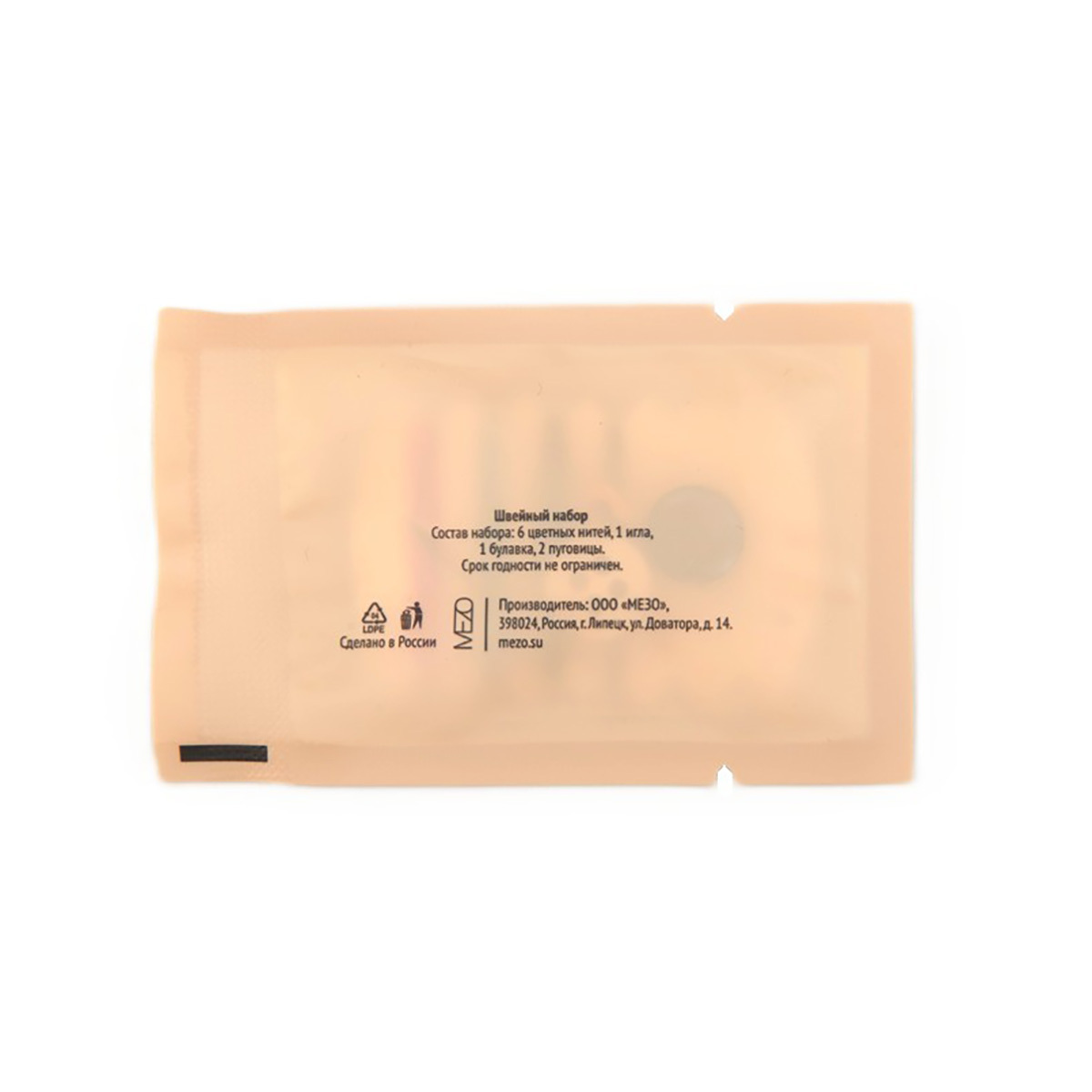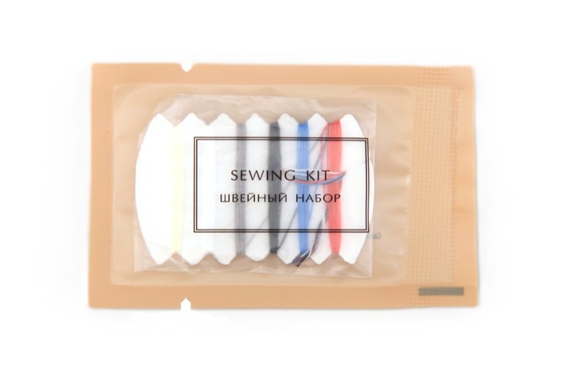 В набор входят: нити зеленого, желтого, серого, красного, белого и черного цветов, 2 пуговицы черного и белого цветов (с 4 отверстиями), 1 булавка золотого цвета, 1 иголка.