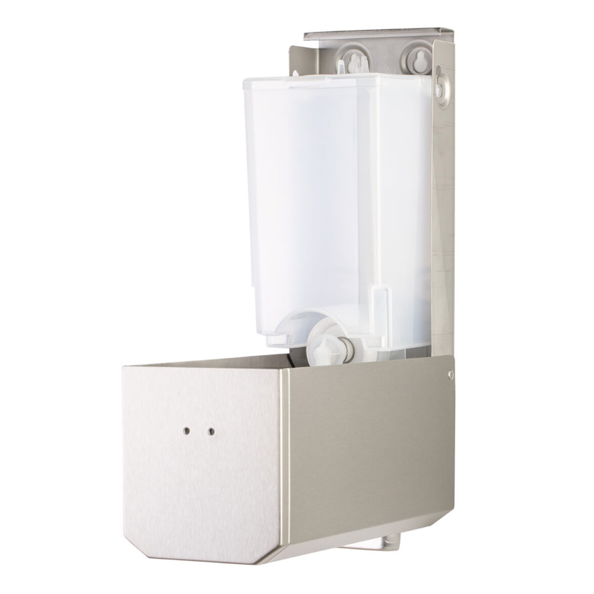 Диспенсер для пенного мыла Veiro Professional. Прочный полностью металлический корпус (сталь 0.8 мм) и специальное покрытие против отпечатков пальцев обеспечивают премиальный внешний вид и сокращают расходы на обслуживание и внеплановую замену. Внутренняя наливная колба объёмом 1,5л рассчитана на 3500-4000 доз мыльной пены, что заметно сокращает периодичность обслуживания. Специальное смотровое окно предназначено для визуального контроля расхода и долива мыльного средства.
