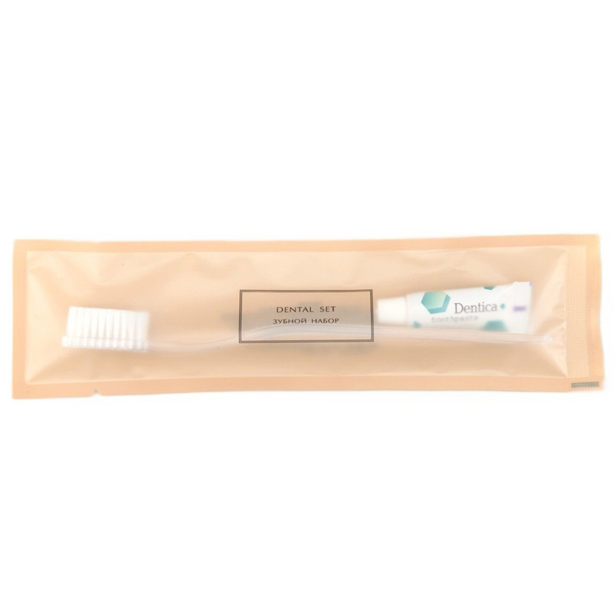 В комплект входят пластиковая зубная щётка длиной 18 см с щетинками средней жёсткости и зубная паста в тубе 3 гр с освежающим ментоловым ароматом. Этот набор обеспечит гостей всем необходимым для полноценного ухода за полостью рта.